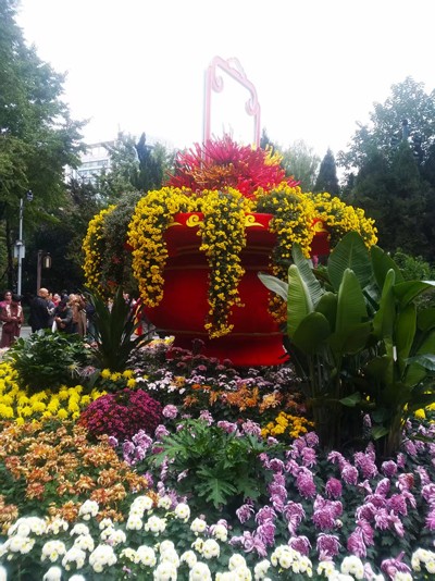 一走进人民公园,迎面可见百余种菊花各显美态,争奇斗艳。 人民公园北大门广场的"锦绣天府 菊颂今秋″超大盖碗茶雕搭配竹编桌椅,烟火成都的休闲气息展现!沿着两旁的菊花走廊前行至大草场展区,″穿越千年,古蜀双壁″,太阳神鸟与三星堆青铜面具在菊花中跃动,菊花丛喚醒了历史。走到中心花坛,看见"诗意成都,金秋菊韵"白居易咏菊诗意展现,姹紫嫣红,金菊如栗;转过一片树林,来到纪念碑广场的″铭记丰碑·礼献先烈",以盛开的菊花花蓝,寄托着对先烈们的深切敬意。