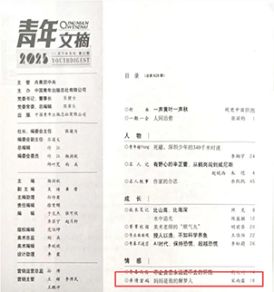 毋庸置疑,母爱历来是作家笔下的重要书写对象。从孟郊的诗歌《游子吟》到王冕的《墨萱图》,从冰心的散文《母爱》到贾平凹的《我的母亲》,从歌曲《妈妈的吻》到《世上只有妈妈好》……丰富的文艺体裁都在歌颂母爱。在表现母爱、母子关系的诸多文艺作品中,如何推陈出新,值得创作者思考。2025年11月下半月刊的《青年文摘》“亲情密码”栏目刊登了土家族青年作家宋雨霜的散文《妈妈是我的解梦人》,该文视角独特,文笔清新,故事感人,受到读者好评。
