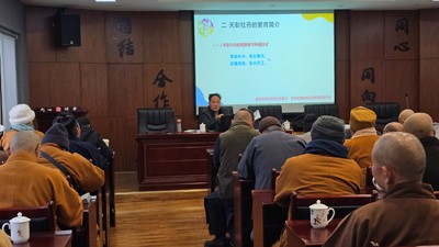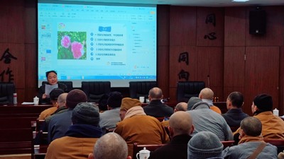 2024 年 12 月 12 日,市规划和自然资源局老科协分会的老科技工作者、市老科协牡丹文化专委会副主任杨礼通,走进彭州市委统战部培训中心会场,为彭州市各宗教寺庙的负责人举行了一场牡丹知识的交流培训。