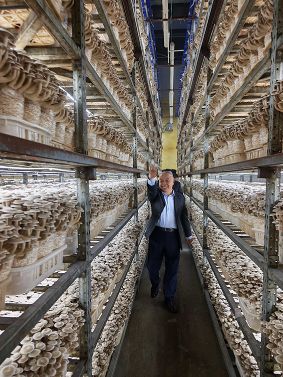 调研期间,调研组深入企业生产一线,依次观摩食用菌拌料、装包、消毒杀菌、接种、智能化培育全流程,现场察看72天、98天不同阶段菌包生长状况,详细了解鹿茸菇100天出菇周期、日产100吨的规模化产能数据。在智能菇房内,环境温湿度、光照、通风实现全流程精准调控,自动化设备高效运转,直观展现了传统食用菌种植向数字化、标准化、智能化转型的显著成果,调研组对此给予高度评价。随后,调研组还走进菌菇科普展厅,全面了解企业技术创新历程、产业布局及发展规划。