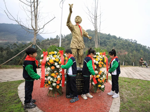 2月15日,华蓥市双河小学开展了“先烈永不忘 吾辈当自强”——我为“小萝卜头”佩戴红领巾活动。活动之初,由华蓥市双河小学少先队大队长刘梓然同学,为“小萝卜头”佩戴红领巾,给队员们讲“小萝卜头”的事迹。小萝卜头是中国年龄最小的革命烈士,牺牲时甚至不满9岁,如果在今天,他也是一名光荣的少先队员,在小萝卜头的雕像前,队员们不约而同地一起唱响了队歌,歌声回荡在山谷。最后由4位优秀少先队员向“小萝卜头”敬献花篮,全体肃立向革命烈士默哀,来表达后辈们的无限敬仰之情。