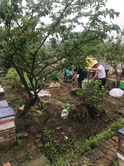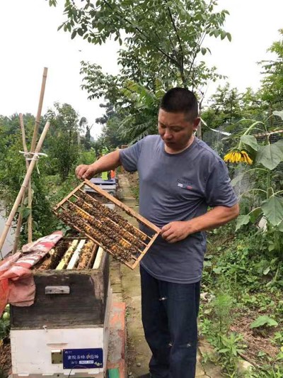 如何在示范蜂场建设中打造特色亮点,持续提高蜂产业综合效益?近两年来,胡建均经过省内外养蜂场的多方考察,及时转换蜂产业发展思路,按照示范蜂场建设的高标准要求,注重在1.6亩固定养蜂场上做活“文章”。在具体做法上,胡建均充分利用有限的1.6亩养蜂场地,除了均匀有序地摆放120箱蜜蜂,还在蜂箱间隙地栽植了蓝莓、杨梅、枇杷、桂圆、桃子、李子、葡萄、杏子、石榴、柑桔、猕猴桃、车厘子以及宁夏枸杞等30余个品种的果树及花卉,并在蜂场中心新建起0.2亩的养鱼池,以便蜜蜂采集安全水源。对此,胡建均解释,“这样通过示范场建设,将把养蜂场打造成良种育种场,为蜂农提供更多优良品种。目前,蜂场已和四川农业大学杨建东教授带队研究生开展蜂种组配工作。同时,不同季度的果树一年四季都有花开,蜂群通过就地采花酿蜜,果树授粉效果更好,水果品质和产量也会更高。至此,示范蜂场就成为宣传养蜂科普知识、开展水果采摘体验活动的一个基地。”