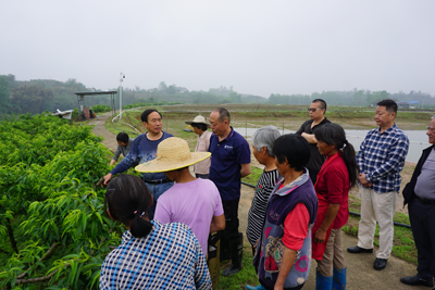 农业(委)专家一行首先来到沿滩镇詹井村四川昊川水产养殖公司的黄桃种植基地,该公司负责人杨勇和十余名果园管理工人早就在现场等待,看到专家们到来后,立即就介绍起来“我们这个200多亩的桃园,4年多了,以黄桃为主,去年开花结果都正常,今年开花也很好,但我们在一个生物农药销售商指导下打了七八种药,现在结果却少得可怜,新发的枝条也很弱,不知道咋回事,都不知道该怎么办了,你们来了就好了”。经过现场察看,我区花椒和水果专家唐奎诗一针见血指出问题所在“一是整体植株生长势弱,二是去年植株修剪不当,导致内堂枝条量严重偏少,三是用药不当造成大量落果和弱果”。唐奎诗专家走近桃树,对不同树势和结果的情况,对杨勇和果园管理员工针对性的传授管理技术“春季新发枝条长势旺,喷施低倍多效挫溶液控梢保果;由于结果量少,暂不蔬果;喷施磷酸二氢钾壮梢壮果。”当即杨勇就表达了感谢,并立即对之后的工作进行了安排部署。专家们还对该公司指出了如何保障桃园管理不影响水产养殖的注意事项。