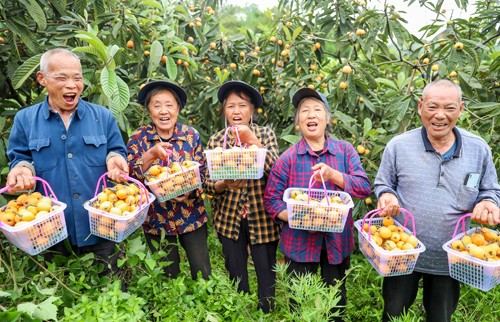 2024年4月20日,四川省华蓥市永兴镇陈家湾村的果农,在展示刚采摘的从苏州引种的优质枇杷。