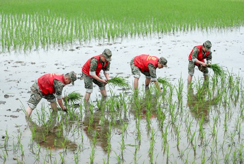 2024年4月22日,四川省广安华蓥市退役军人事务局组织的退役军人志愿服务助耕队,在华龙街道东方村冒雨帮助缺劳农户抢栽秧苗。