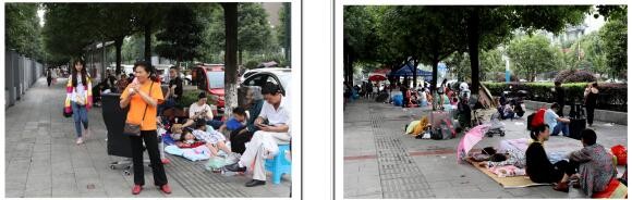 左图→巡场文化公园门口路边的避难场面;右图→巡场迎宾广场内的避难场面。