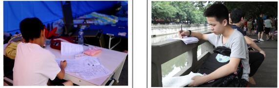 在安民桥头帐篷边做作业的小女孩们 在僰文化广场做作业的小男孩
