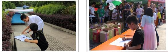 在僰文化广场帐篷边做作业的小男孩 在僰文化广场做作业的小男孩