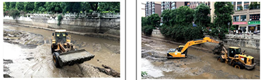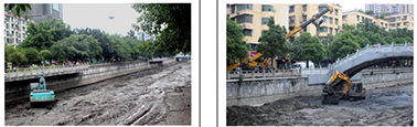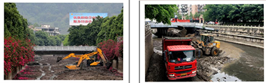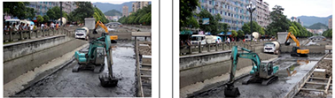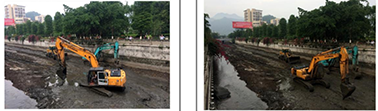 左图:2012年3月2日,安民桥下游段清理河底场面;右图:2014年11月5日,珙县人民医院门口段清理河底场面。