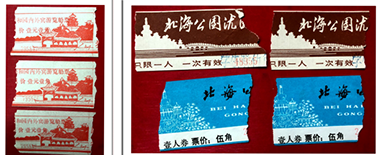 图(1):在“颐和园”坐船的船票1.1元/人;图(2):参观“北海公园”的成人门票0.5元/人、学生门票0.25元/人。