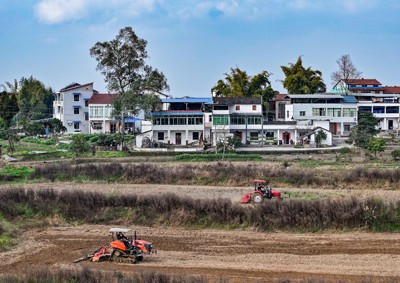 2025年2月26日,四川省华蓥市永兴镇马架坪村农机服务中心的农机手,驾驶俗称“铁牛”的农机具为农户耕整用于播种育苗的农田,助力春耕生产。(邱海鹰)