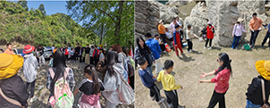 环保行动结束后,队伍来到一处平坦的河岸空地。野餐垫铺开,大家摆上精心准备的食物、零食和水果。尤其令人感动的是,何春老师亲自下厨,带来了孩子们都爱吃的凉面。志愿者们与孩子们席地而坐,在大自然的怀抱中共享温馨惬意的午餐。餐后,孩子们在草坪上追逐嬉戏,在大石上攀爬探险,欢呼声此起彼伏,处处洋溢着童真的快乐。欢乐之余,安全教育从未松懈。针对春季水情特点,应急救护讲师志愿者母继超现场为孩子们讲解了防溺水安全知识,反复强调“不靠近水边”的底线要求。随后,尹老师组织大家开展了“冰袋传递”“蒙眼听声摸奖品”等趣味游戏,现场气氛热烈。活动尾声,全体人员合影留念,为这次难忘的春日之行留下美丽的身影。