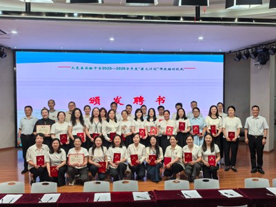 王维荣校长郑重宣布本学年师徒结对名单后,李华清书记、王维荣校长、赵焱专职副书记为各位导师颁发聘书。沉甸甸的聘书,是学校对骨干教师专业能力的认可,更寄托着“以老带新、以新促老”的美好愿景。