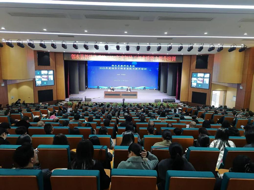 次日下午,邻水县教科体系统 2025 年度领导干部素质能力提升培训接续开讲。培训由县教科体局局长范小波主持,采用 “主会场 + 分会场” 联动模式:县教科体局机关及直属单位全体干部职工、全县各校(园)党组织书记与校(园)长、城北及城南责任区副校级干部在第六小学演播厅主会场参训;各责任区督学组长、其余校(园)副校级干部及中层干部在各分会场同步学习,实现县域教育管理干部培训全覆盖。