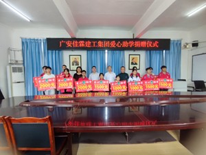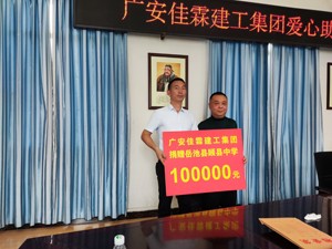 活动中,民盟盟员、广安佳霖建工集团邹佳霖现场为岳池顾县中学捐赠建设资金100000元,为10多名贫困学生捐赠爱心学金29500元。受资助学生代表发了言,感谢邹佳霖叔叔爱心捐助,我一定努力学习,做一名善良、品德高尚的人,长大后以实际行动回报社会的关爱和支持。岳池县顾县中学负责人向四川省广安佳霖建工集团赠送了“建工翘楚行善举,助学显爱惟德馨”的锦旗。