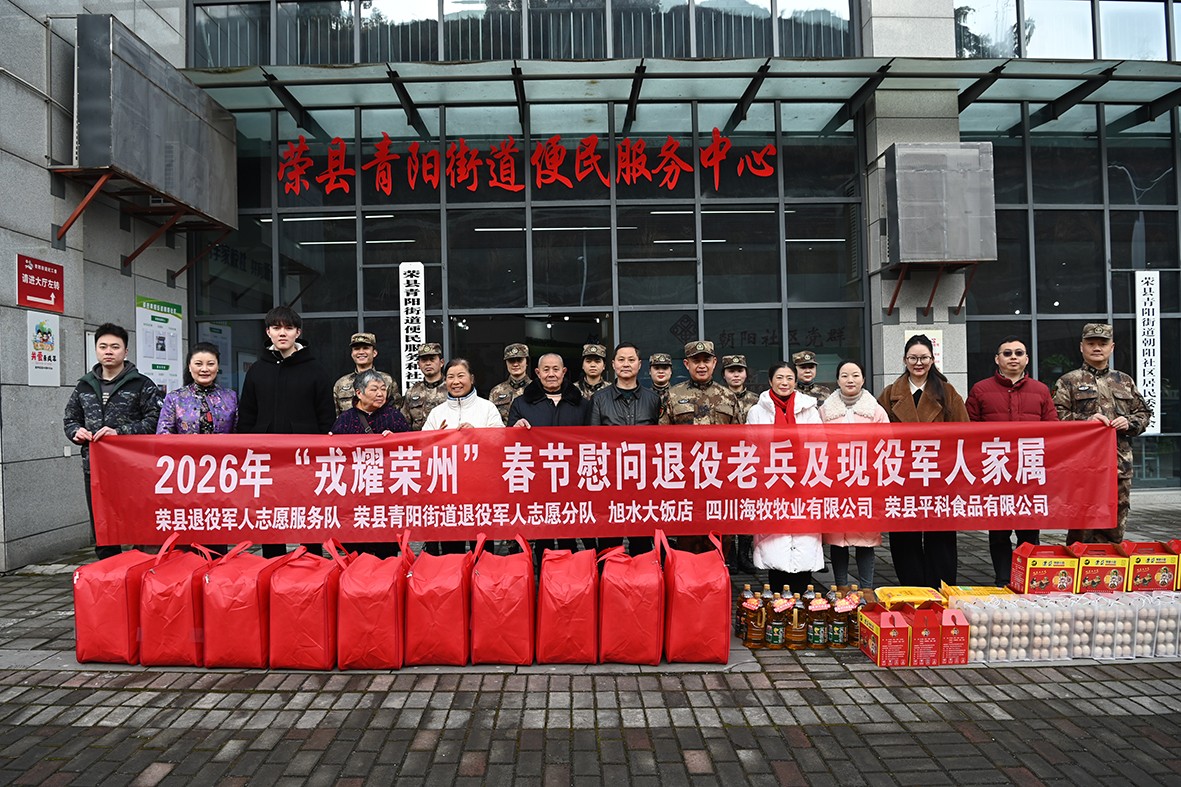 2月11日,马年新春佳节前夕,荣县退役军人志愿服务队联合荣县青阳街道退役军人志愿分队、四川海牧牧业有限公司、荣县平科食品有限公司、旭水大饭店、四川省拥军模范龚怡、台湾嵌入式暨单晶片发展协会副秘书长蒋莉、以及寒假社会实践的同学,组成慰问组深入旭阳镇、青阳街道、东兴镇的城区及农村,开展2026年“戎耀荣州”春节慰问活动,为唐运槐,龚池贵,蒋芳华、刘玉文、张绍富等18名退役老兵、现役军人家属、困难党员及群众送去新春祝福与关怀。