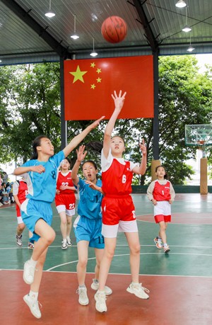 2023年4月4日,来自四川省华蓥市各中小学校的女选手,在参加该市2023年中小学校园篮球总决赛。