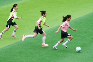 2023年4月13日, 四川省华蓥市双河三小的女子足球队成员在绿茵场上参加颠球训练,迎接7月28日至8月8日在成都举行的世界大学生夏季运动会。