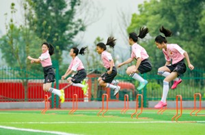 2023年4月13日, 四川省华蓥市双河三小的女子足球队成员在绿茵场上参加提高身体素质的栏架训练,迎接7月28日至8月8日在成都举行的世界大学生夏季运动会。