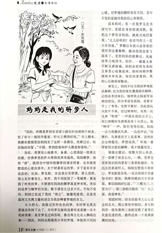 毋庸置疑,母爱历来是作家笔下的重要书写对象。从孟郊的诗歌《游子吟》到王冕的《墨萱图》,从冰心的散文《母爱》到贾平凹的《我的母亲》,从歌曲《妈妈的吻》到《世上只有妈妈好》……丰富的文艺体裁都在歌颂母爱。在表现母爱、母子关系的诸多文艺作品中,如何推陈出新,值得创作者思考。2025年11月下半月刊的《青年文摘》“亲情密码”栏目刊登了土家族青年作家宋雨霜的散文《妈妈是我的解梦人》,该文视角独特,文笔清新,故事感人,受到读者好评。