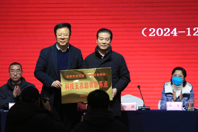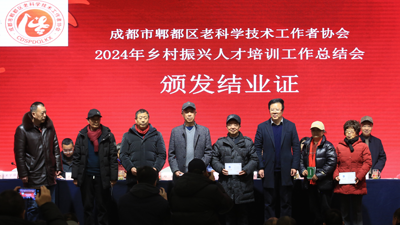 成都市老科协副会长邱颖为跨年度参加农业基础理论及实用技术培训的农民学员代表颁发了结业证书;为市、区两级老科协共建科技支农助农联系点(成都汇菇源科技有限公司)举行了授牌仪式。