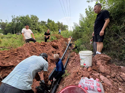 8月6日,炎炎烈日下,金堂县老科协秘书长彭世选组织带领专业技术施工人员争分夺秒地为高板同善村抢装电力提灌站。当日凌晨7点,天刚破晓,金堂县老科协的同志和施工人员已从40公里外的县城驱车抵达了高板同善村11组提灌站工地。旱情如火,容不得丝毫耽搁,施工人员迅速投入到紧张的提灌站管道安装工作中。八月的金堂酷热难耐,太阳高悬,炙烤着大地,施工人员和县老科协会员的衣服很快就被汗水湿透,紧紧贴在身上,但他们没有丝毫懈怠和怨言。
