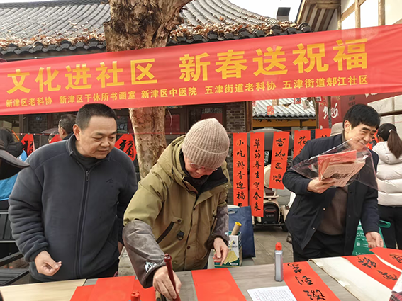 辞旧岁,墨香袅袅迎新春;纳吉福,红纸灼灼送温情。为深入学习贯彻落实区委十五届九次全会精神,持续做响“古蜀之源· 诗画新津”文旅品牌, 1月26日恰逢农历腊八节,一场“迎新年、送祝福”文化进社区活动,在“市井味、烟火气”的复兴街如期举行,书法老师义务为社区群众书写春联和“福”字,为大家送上最真挚的新春祝福。新津区老科协、区干休所书画工作室、五津街道老科协、寿阝江社区组织和承办了此次活动。
