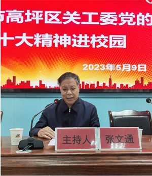 宣讲开始前,高坪三中副校长邓刚致辞。他对关工委宣讲团的到来表示热烈的欢迎和衷心的感谢。并着重介绍了学校的办学理念和发展过程。邓刚副校长表示学校将进一步学习和落实党的二十大精神,立足学校实际,把高坪三中的孩子们培养成有坚定的理想信念、有高尚的品格修养、有敢于创新的勇气、有艰苦奋斗的精神的新一代接班人,力争把学校关心下一代的工作推上新台阶。