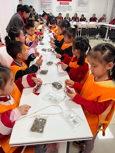 来自金童幼儿园的20名大班幼儿如同欢快的小天使,与20个老年家庭成功“结对”。在老师和志愿者的耐心引导下,孩子们用稚嫩的小手认真地制作香囊。他们全神贯注,将满满的敬意与祝福细细装入香囊之中,那专注的神情仿佛在完成一件无比神圣的使命。随后,孩子们郑重地将自己亲手制作的香囊敬献给长者。当老人们接过这份充满童心的礼物时,脸上洋溢着幸福的笑容,眼中闪烁着感动的泪花。这份小小的香囊,不仅是一次简单的手工互动,更是一堂生动的美德实践课,让尊老爱老的种子在孩子们幼小的心灵中生根发芽,茁壮成长。