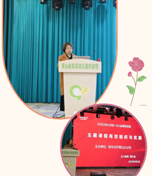 接着,周老师从主题背景、主题脉络、主题目标,以及活动中教师和家长的准备等方面,进一步为老师们进行了快速、全面的梳理,引发了大家深度教研的思考。随后,又以卓越课程中“寻找春天”为例,通过主题梳理、主题详解,帮助教师更好的根据主题进行审议和实施。针对教学中教师在主题实施中的重点、难点方面,又结合一首音乐游戏《小小蛋儿把门开》为例,从活动准备、活动环节进行了细致的梳理分析,为老师们今后更好地把握与开展教学活动指明了方向。