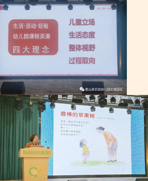 培训中,周老师围绕主题课程背景、课程理念、课程实施三个方面,结合课程中的真实案例,深入浅出的向老师们讲解了主题课程在实际教学中的运用,让大家进一步理解了以儿童立场、生活态度、整体视野与过程取向为目标的课程理念。