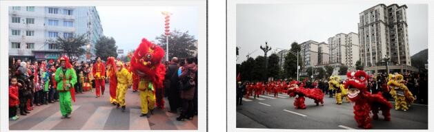 左图→2016年2月20(农历正月13)日珙县闹元霄活动在巡场僰文化广场露天耍狮子场面; 右图→2018年2月27(农历正月12)日,珙县闹元霄活动在巡场僰文化露天广场举行,其中底洞镇代表队的龙灯、狮子制作得特别漂亮。