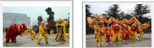 左图→2015年2月20(农历正月初二)日,珙县罗渡苗族乡王武寨举办一年一度苗族特色的“花山节”,其中有耍狮子的场面;右图→2015年2月6(农历腊月18)日,巡场民俗传播队到巡场镇茨黎山庄给老板拜年,其中有耍狮子的场面。