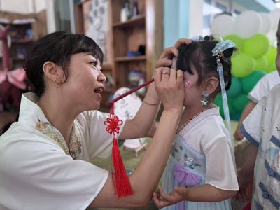 随后,铿锵的锣鼓声震响全场,一场活力四射的传统舞狮表演瞬间点燃节日热情,正式拉开游园狂欢的序幕。家长与孩子们身着飘逸雅致的汉服,穿梭于精心布置的园区,仿佛步入时空长廊,沉浸式体验中华文化的博大精深。