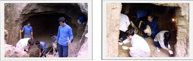 2000年9月30日,我在挖掘现场拍摄的场面,其中挖到有两枚小铜钱。右图画面中穿蓝色衣服、拿草帽的人是珙县文化馆人员范仲成。