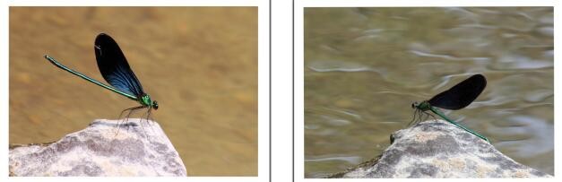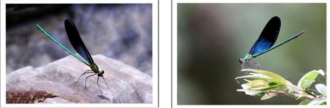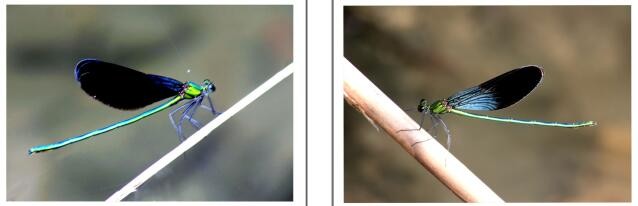 停栖方式:蜻蜓在停栖时,会将翅膀平展在身体的两侧;豆娘在停栖时,会将翅膀合起来直立于背上。