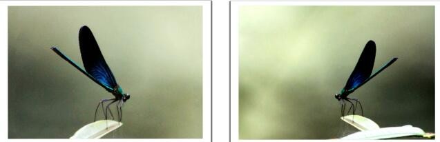眼睛的距离:蜻蜓的复眼大部分是彼此相连或只有小距离的分开;豆娘的两眼有相当大距离的分开,形状如同哑铃一般。