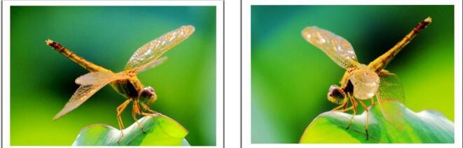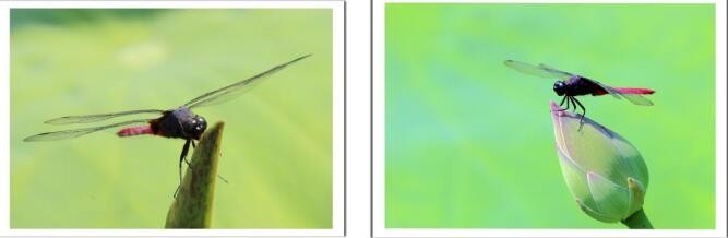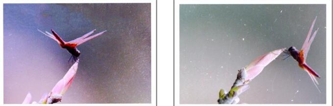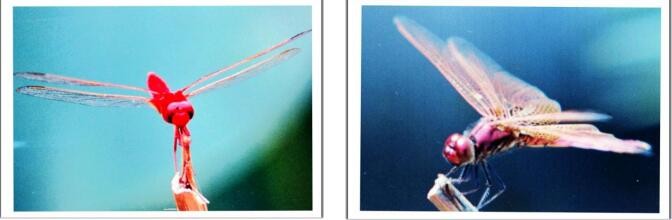 蜻蜓在触落脚点的一瞬间,两侧的翅是向上翘起,显得刚劲有力,站稳后就趴下来。这两张是传统的胶卷扫描图片。