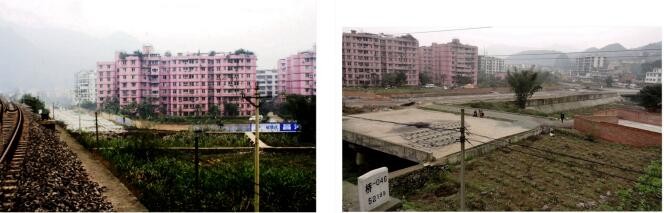 图(1)→2009年11月7日,未建过境桥的场面;图(2)→2012年2月1日,建成的公路桥长25米,桥宽15米,但被遗弃。