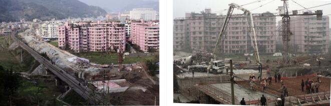 图(1)→2009年12月30日,修建公路桥铺设预制板的施工场面;图(2)→2010年1月20日,修建公路桥桥面现浇钢筋混凝土的施工场面。