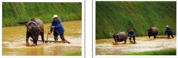 坨田面积不宽,保留着用水牛犁田、耙田方式。