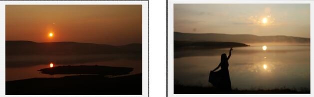 27日凌晨5︰30出发,再到大海子拍日出,汽车仪表气温为13℃。在海子边选好点,6︰35朝霞开始出现,7︰03太阳露出了完整的笑脸。佳能EF-500D相机·套广角镜、设置“8”的光圈、“AV”档自动对焦,手持相机拍摄咋出得了效果?如果改用“M”档,设置“22”的光圈、“1/125”秒的曝光速度和相应的“感光度”,相机架在三脚架上拍摄,肯定是一套精美的作品。