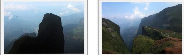 “鸡公山”应该是那座山形像公鸡头而得名,山下峡谷时儿雾气冲天景区一片白雾,时儿乌云密布景区阴暗压抑,时儿烟消云散峡谷深处隐约可见,只是天气不好峡谷真实面目未能看清,有恐高症的我畏惧三分,来都来了不可能退却,强撑着心惊胆跳地边看边拍朝鸡公山主峰方向挪动,一个上午的时间就在主峰附近零星拍摄,没有几张满意的
