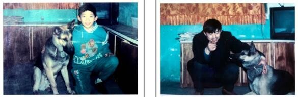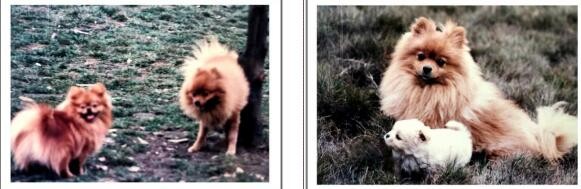 图(1)娇子(狗)有我夫人给它撑腰勇敢地与泼妇(猫)打斗;图(2)我侄女拉着娇子和它的崽崽。