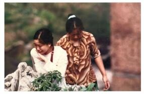 我赶快将相机换上300毫米的长镜头,悄悄爬到上三环地,抓拍了挑粪妇女扶着年轻女子往回走的场面,由于心情着急,又连续上爬三环地还喘着粗气,加之来不及用三脚架,所以拍摄的画面清晰度差。