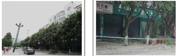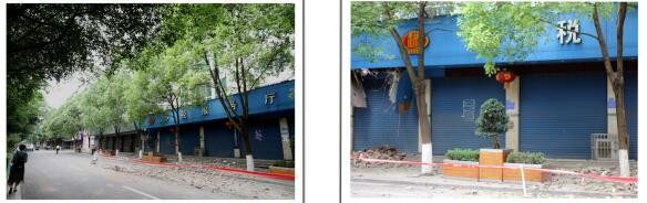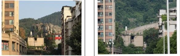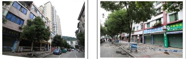 巡场镇“国新联程汽修厂”背后的山头在地震时出现了裂缝,整个山头可能会向右下滑,直接威胁到下面芙蓉苑B区居民小区几百户市民的财产和人生安全,灾后政府用“蚂蚁搬家”的方案将整个山头搬走了——“愚公移山”现代版,图为地震前后对比场面。