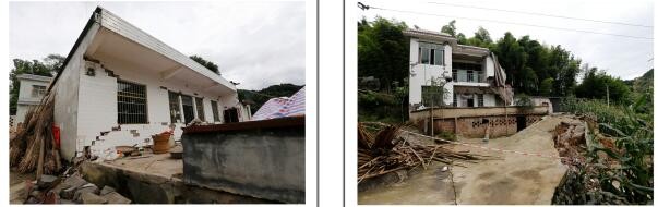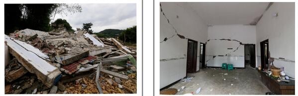 左图→巡场镇新达街...号房屋受损场面;右图→巡场镇中心路51号教育局小区隔墙垮塌场面。