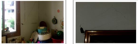 我家客厅南面窗口墙面被拉裂场面 我家其中一间寝室门角墙面被拉裂场面