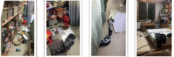 图(1)→我书架上的东西被震下地场面;图(2)→我书架上的摄像机被震下地场面;图(3)→我书架上的“海鸥”相机被震下地场面;图(4)→我寝室里的东西被震下地场面;