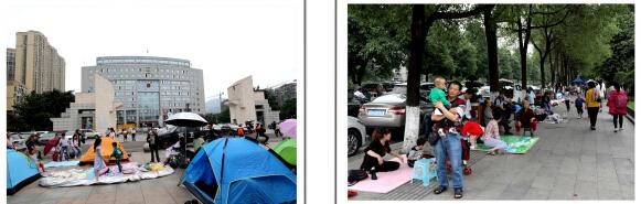 左图→巡场文化公园门口路边的避难场面;右图→巡场迎宾广场内的避难场面。